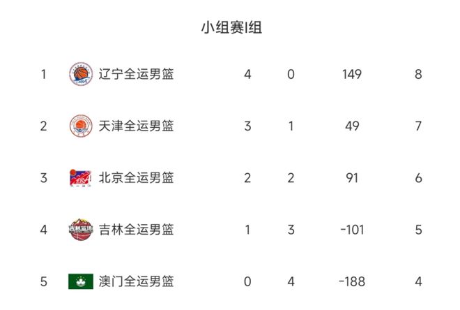 第1名,辽宁队,成绩为4胜0负,积8分;